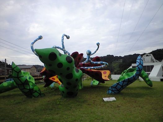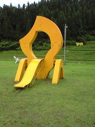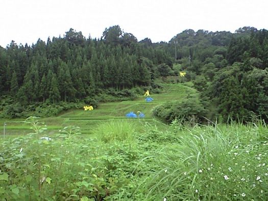 棚田には おおきな オブジェがあちこち